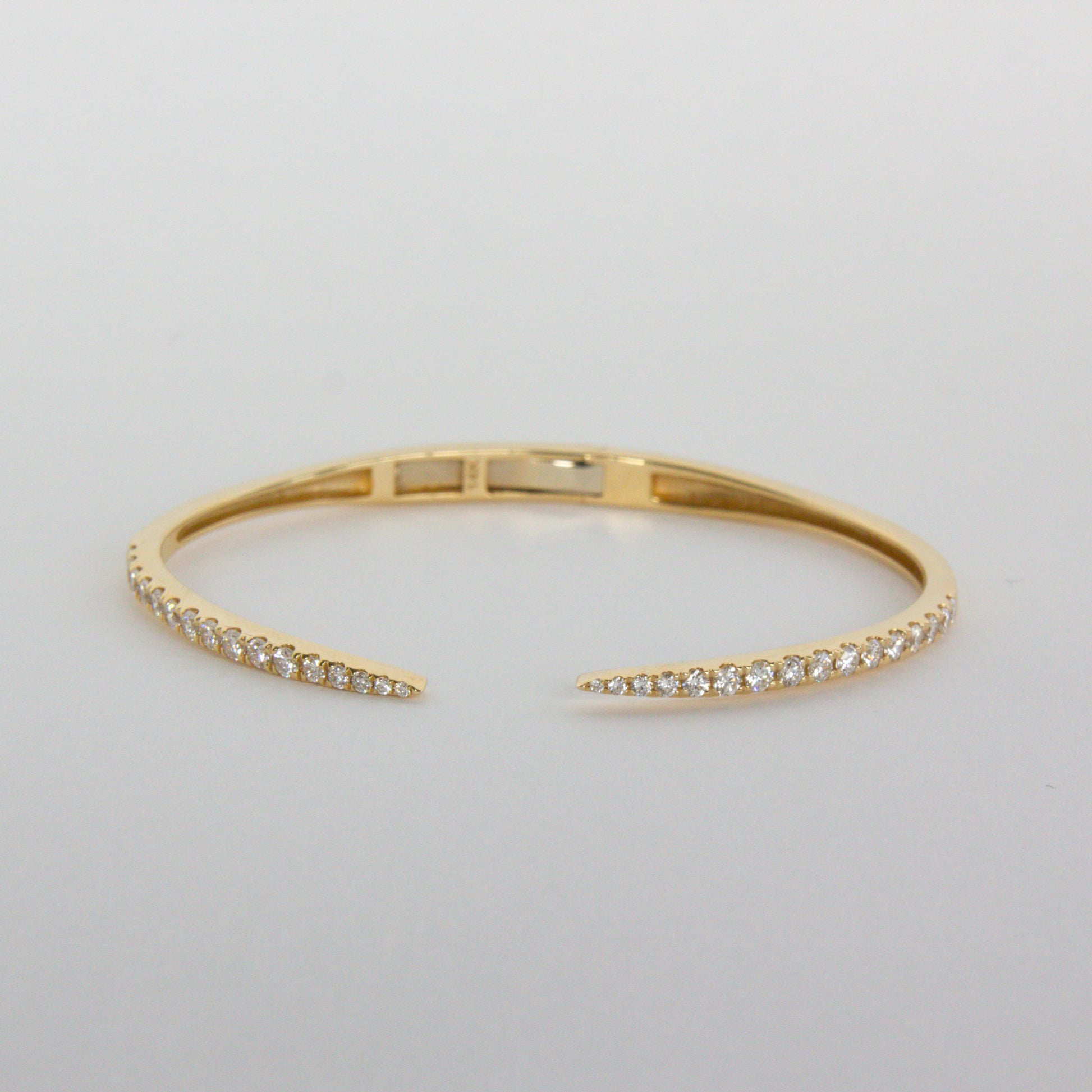 Make a bold impression with the Darby Diamond Open Cuff, a striking balance of delicate craftsmanship and undeniable presence. This hinged open design offers comfortable, adjustable wear while pavé diamonds cascade across the pointed tips, creating captivating sparkle and dimension. Whether layered with other pieces or worn solo, the Darby commands attention with its sophisticated edge. The hinged opening ensures easy on-and-off access, making luxury both beautiful and practical. A true statement piece that elevates any ensemble with refined glamour.
