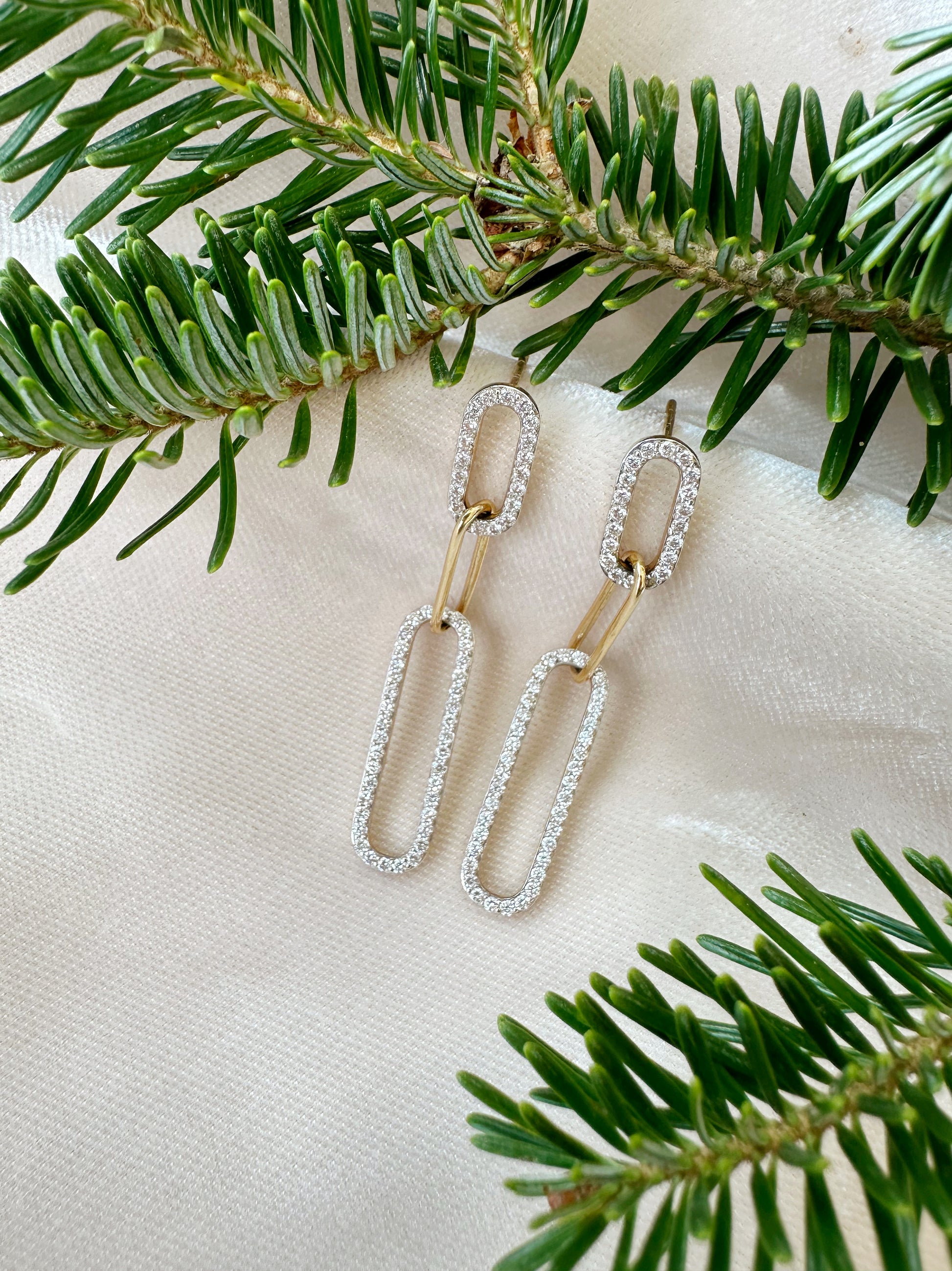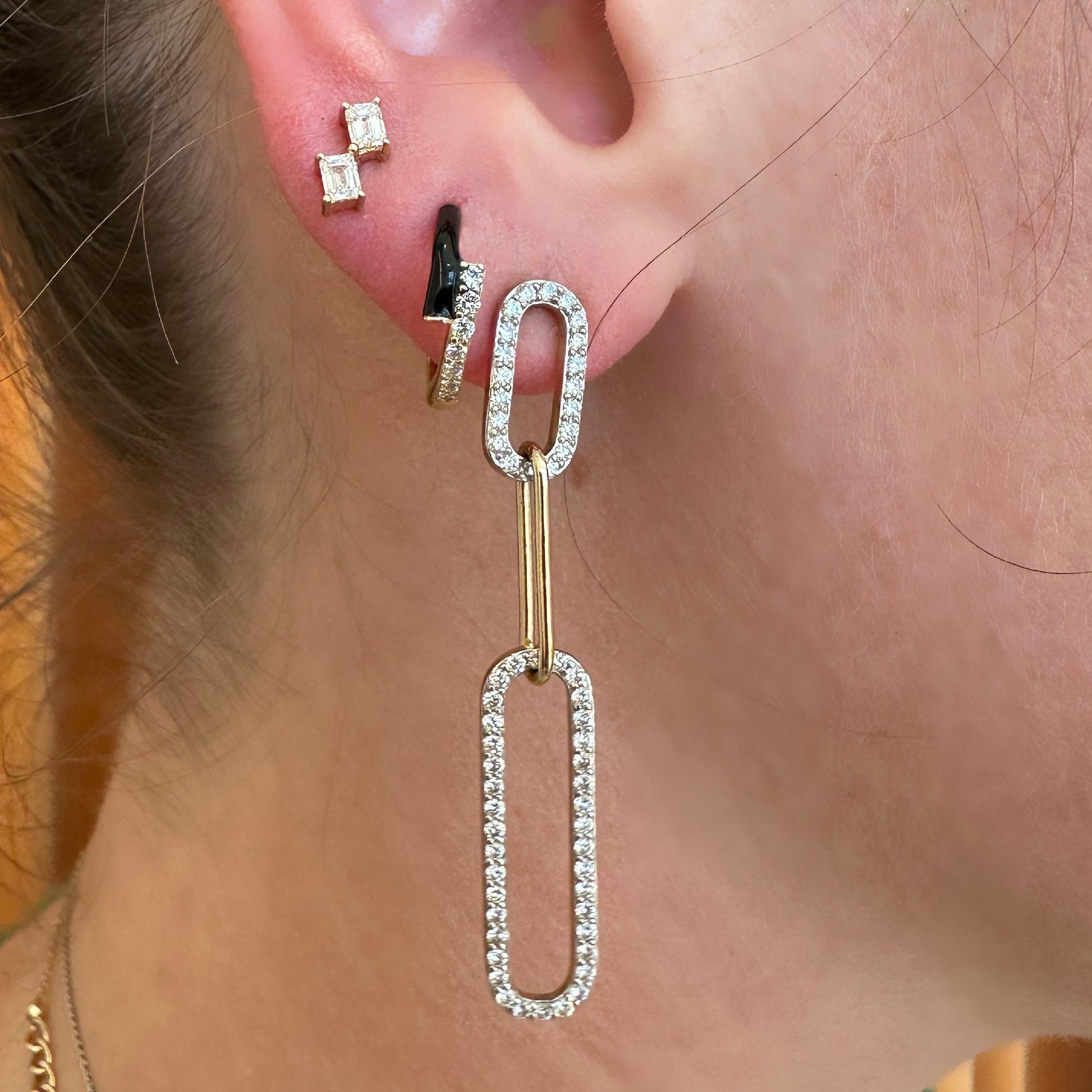 These Christabel 3 Link Diamond Earrings are a timeless classic! Crafted with stunning gold links and adorned with beautiful pave diamonds, they add an exquisite touch of sparkle to any look. Perfect for special occasions or everyday wear, these earrings will take you from day to night in effortless style!