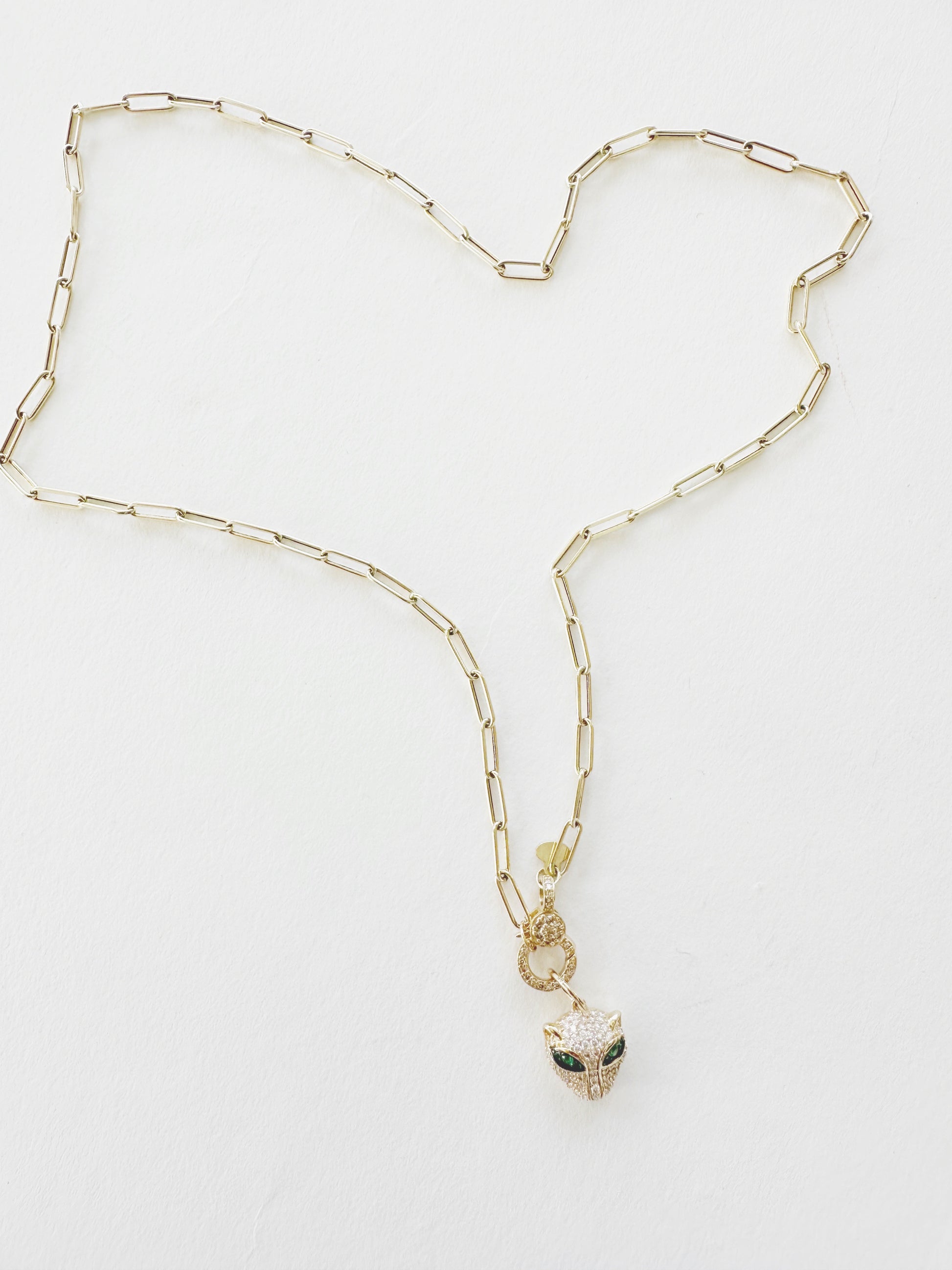 Add a wild touch to your jewelry collection with our jaguar charm! The pave diamond jaguar head is encrusted with large emerald stones, giving it a sleek and exotic look. Embrace your fierce side and let this charm inspire you to be bold and confident!