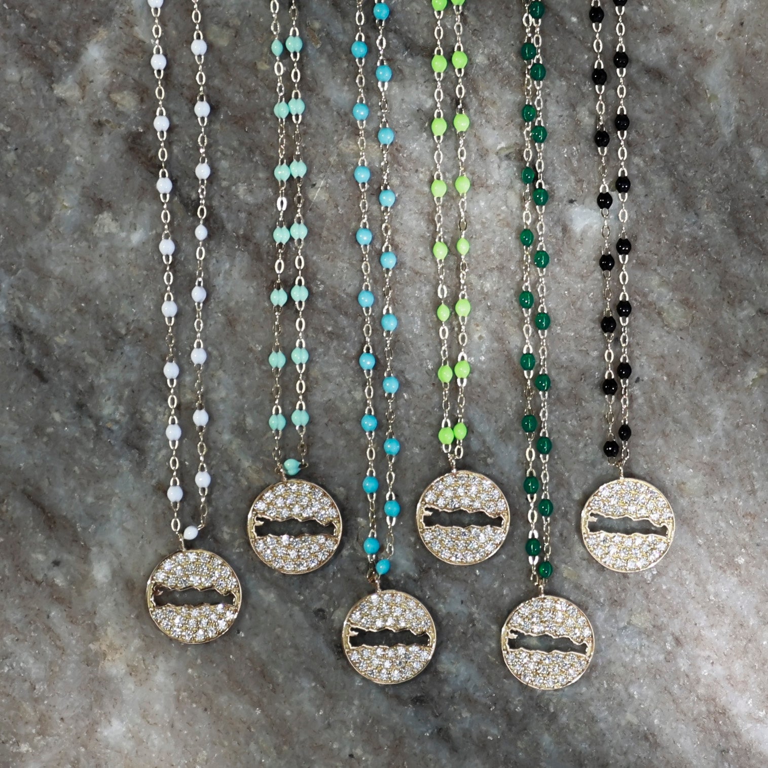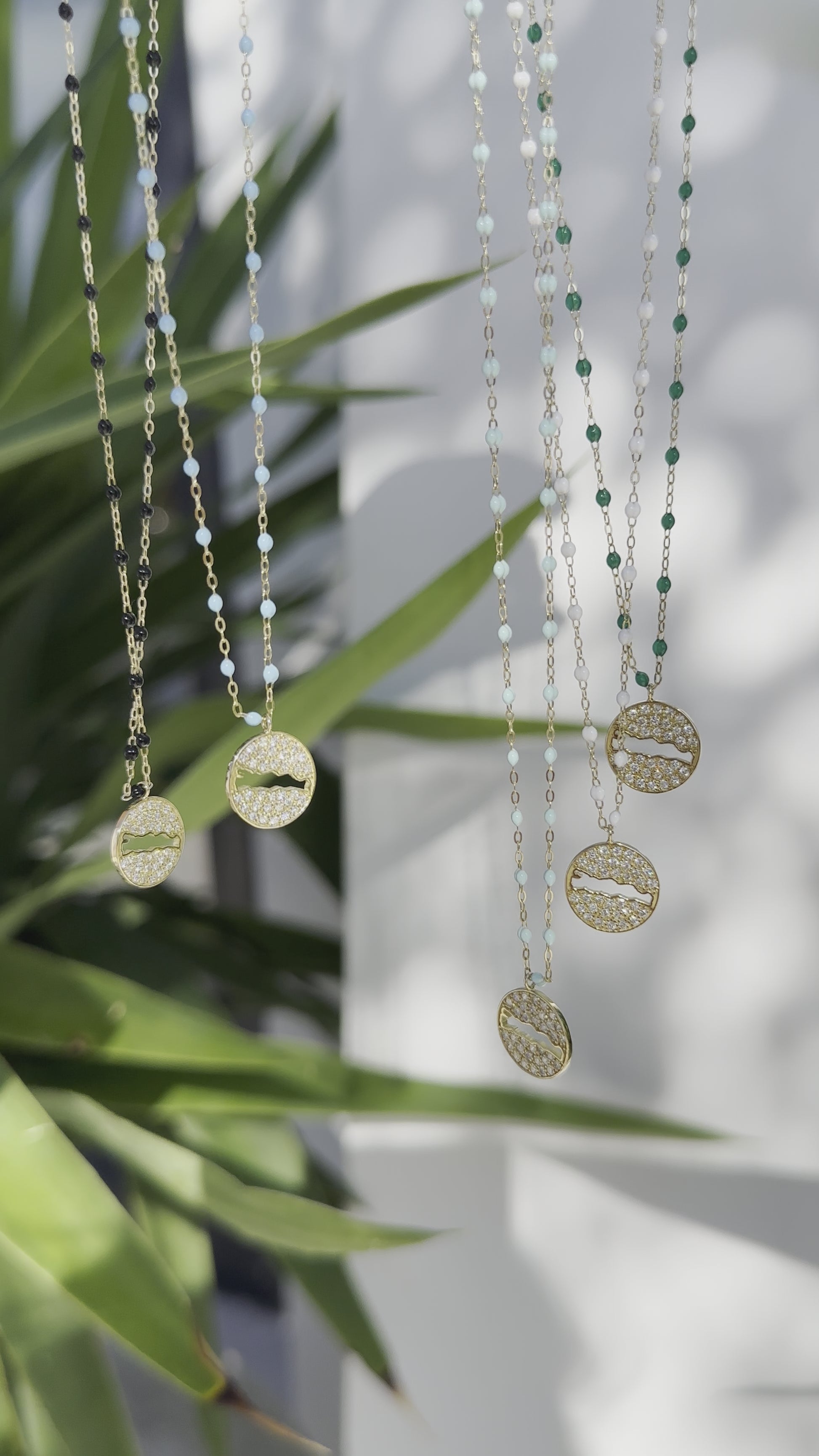 The Le Rive 30A Pave Coin Necklace features the signature delicate chain of 18K gold and resin beads with our exclusive 30A coin charm encrusted in pave diamonds for maximum shimmer.