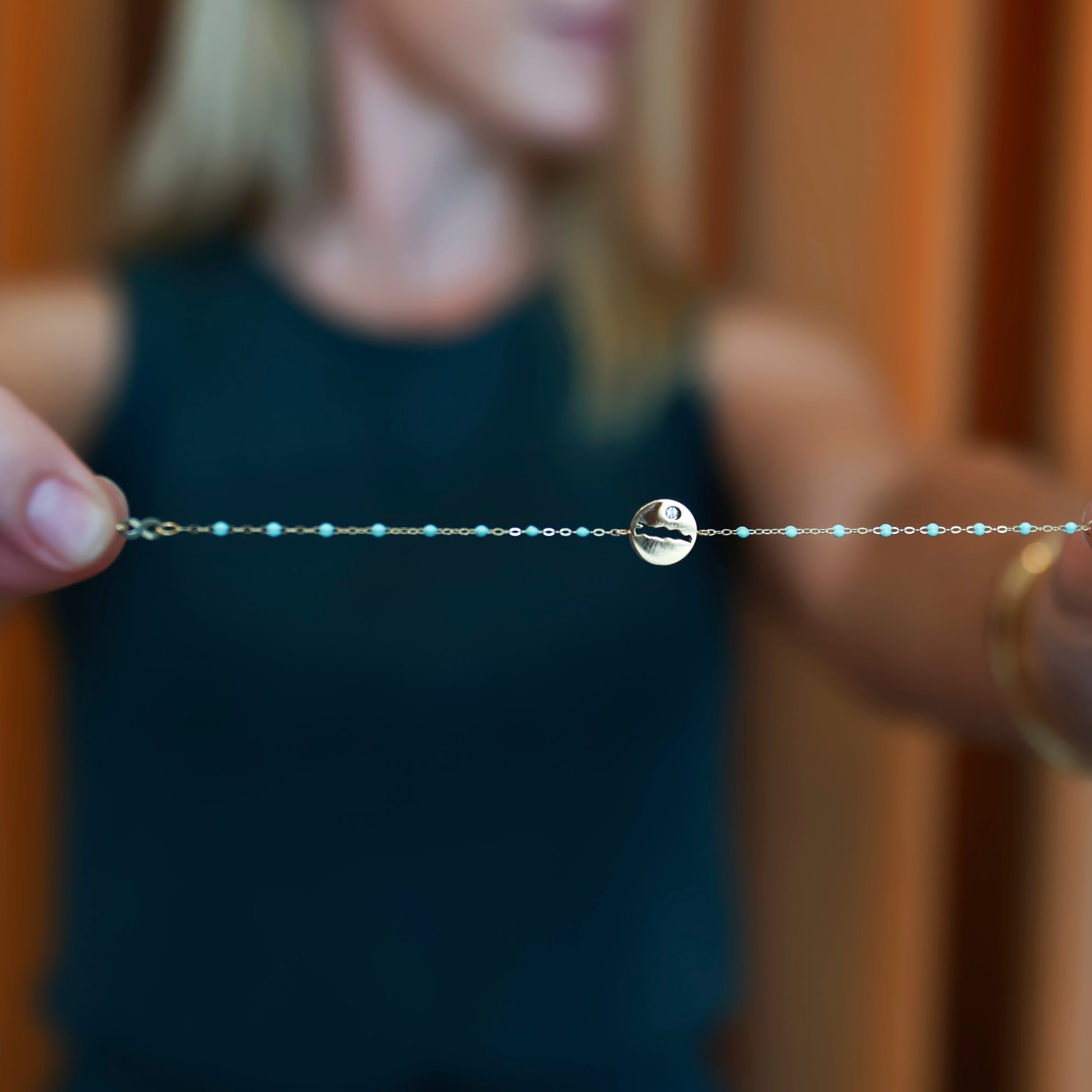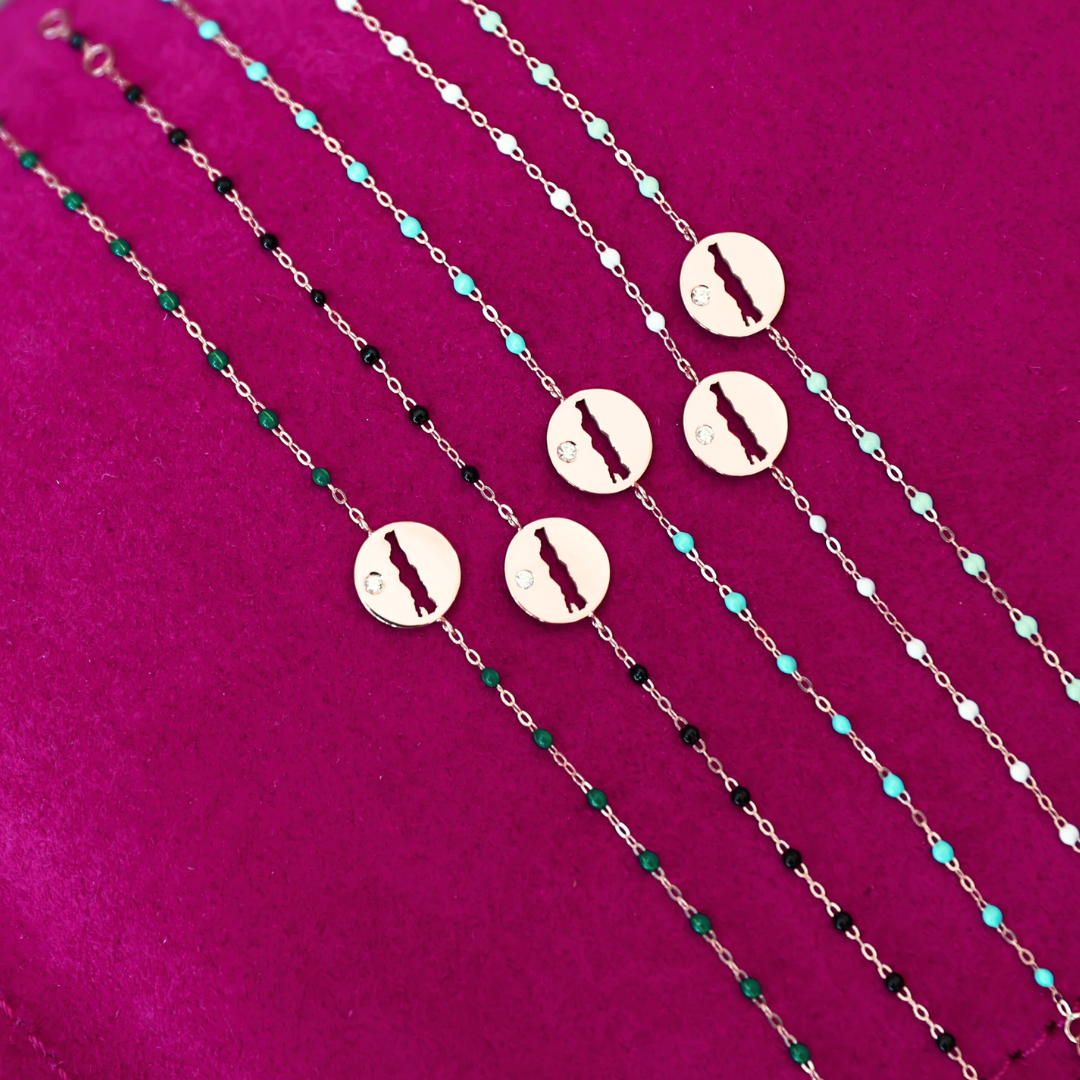 The Le Rive Coin Bracelet features the signature delicate chain of 18K gold and resin beads with our exclusive 30A coin mounted in the center. The single accent diamond is the perfect touch of glimmer.