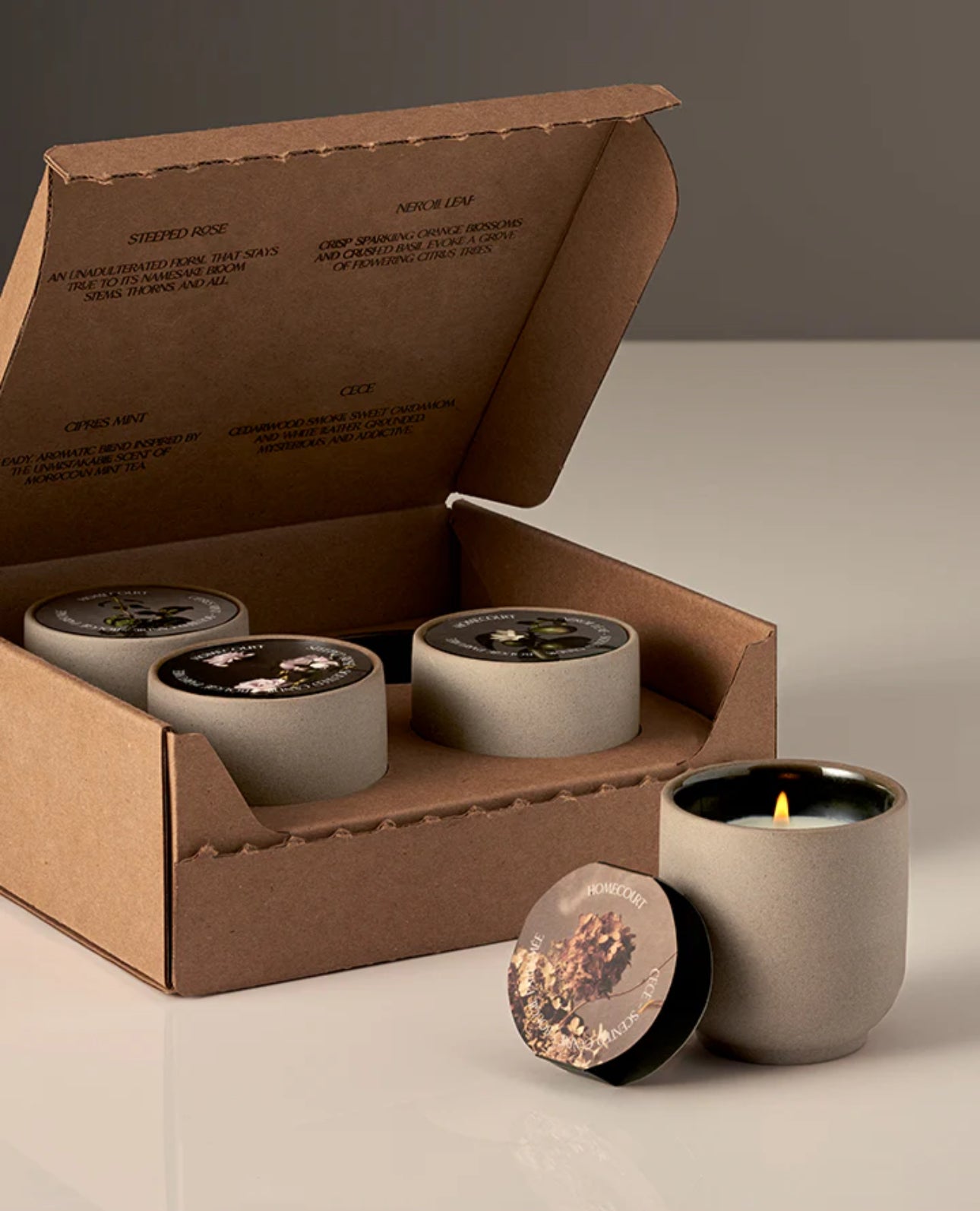 The Candle Discovery Set includes four 2.25 oz votives, one in each of our Homecourt Signature Fragrances. Candles are clean-burning, lushly scented, and designed to enhance any space in the home. Each candle is hand-poured into custom kiln-dried clay vessels.