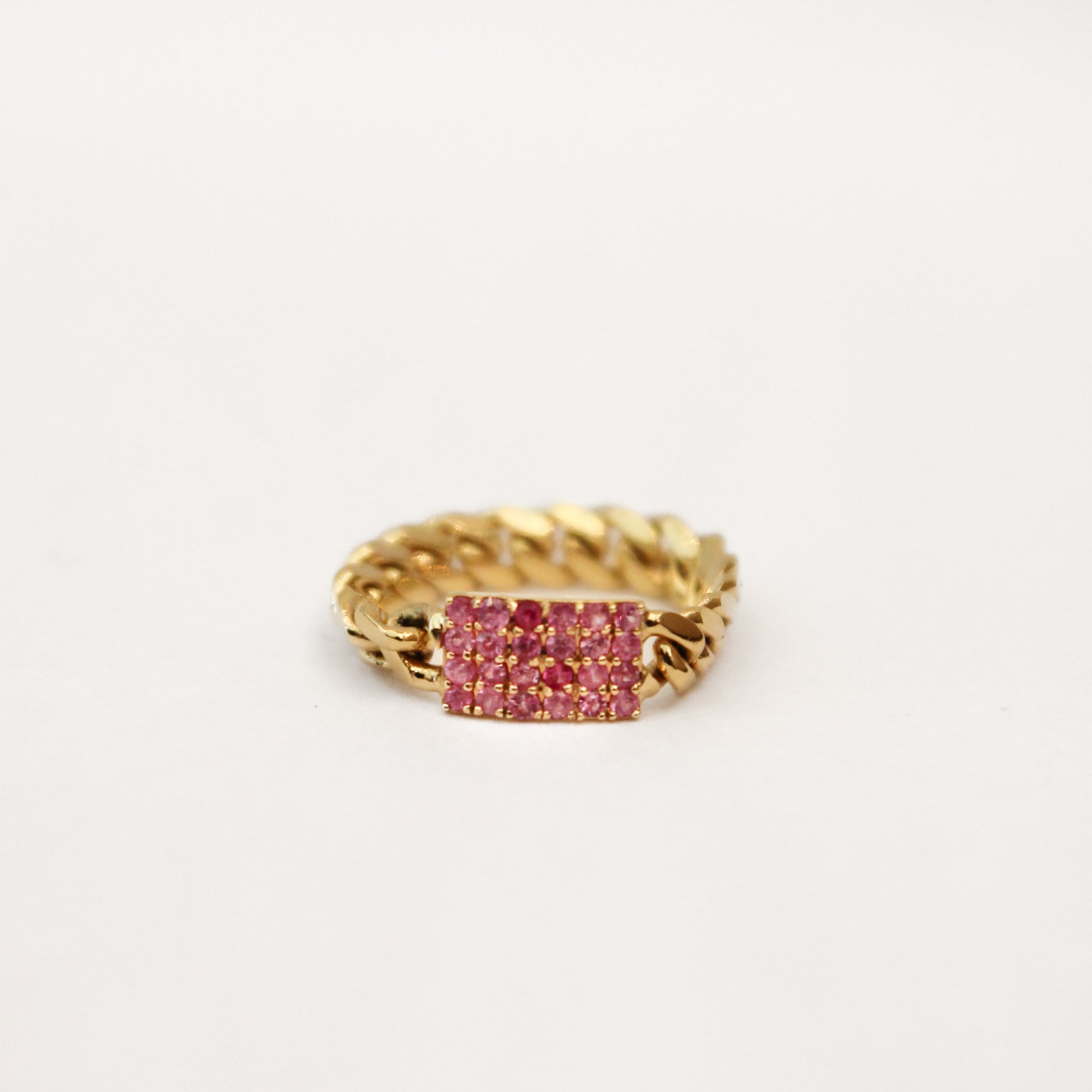 14K YG CUBAN CHAIN PINK SAPPHIRE PAVE RING