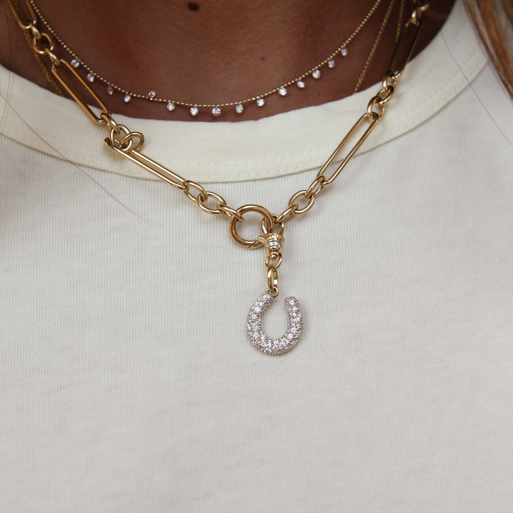 Elevate your jewelry collection with the Beck Horseshoe Charm, exquisitely crafted in 14K gold and adorned with .74 total carat weight pave diamonds. Finished with a white rhodium setting, this charm offers a refined sparkle and durability. Its small Albert clip attachment ensures versatile styling, making it a sophisticated addition to any bracelet or necklace.