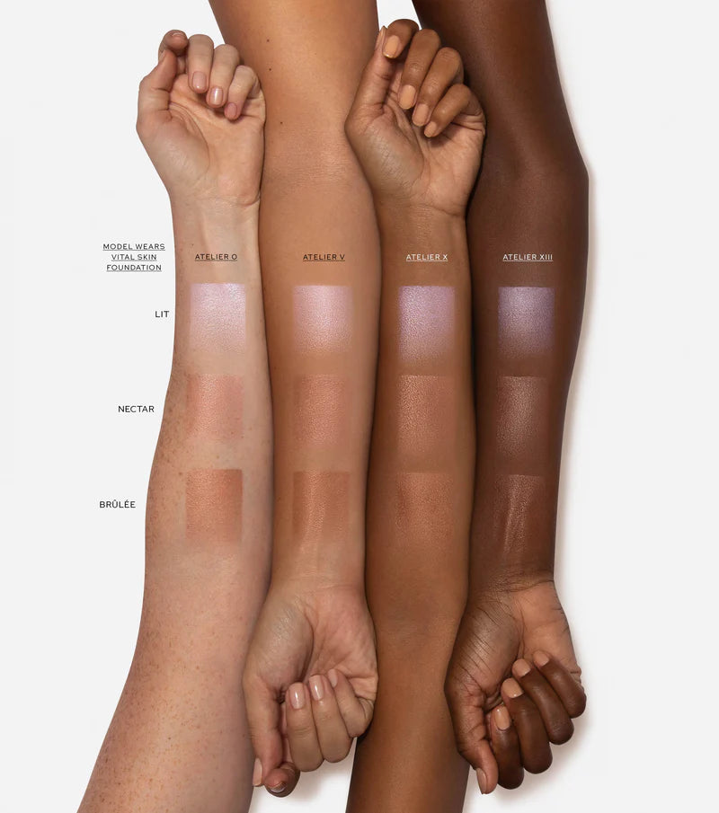 This clean, translucent gel highlighter imparts skin with facial-fresh, radiant clarity. Flattering, light-catching undertones and skin firming ingredients leave a dewy, glassy and unforgettable finish. A quick and hydrating way to perk up dull skin. Dab across cheeks, bridge of nose, cupid’s bow, lips and lids.