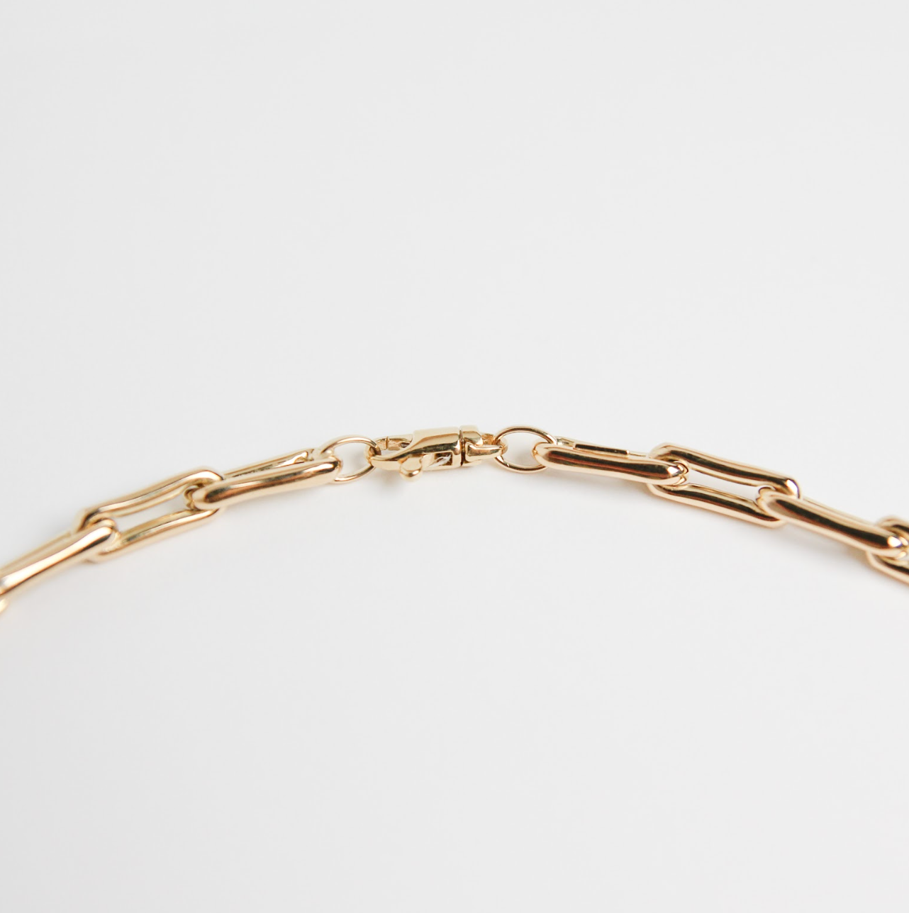 Elegant elongated links form the foundation of this striking necklace, a sophisticated creation by local designer Rebecca Pinto. The 18-inch length offers versatile styling for layering or wearing solo, while the refined construction ensures an effortless transition from day to evening. A timeless piece that celebrates artisanal craftsmanship and understated luxury.