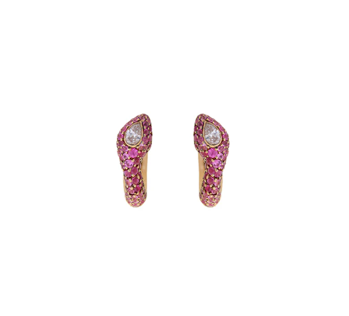 These Basilik Pink Sapphire Huggies feature a sleek design adorned with scattered pink sapphires, creating a delicate shimmer. Pear-shaped diamonds accent the head of each earring, adding refined brilliance. Perfect for elevating any look with understated elegance.