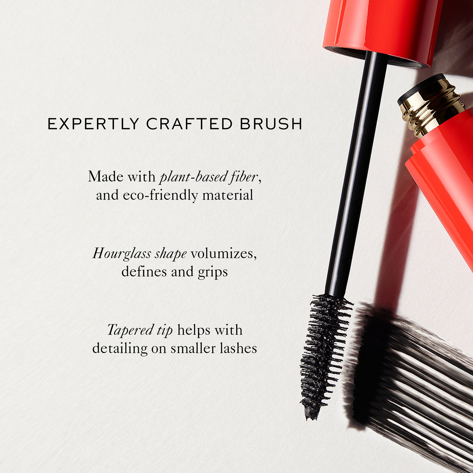 Go natural to bold with an hourglass shaped brush expertly crafted from plant-based filament and designed to catch every last lash. Take your lashes from everyday natural to full and fluttery with just a few swipes.